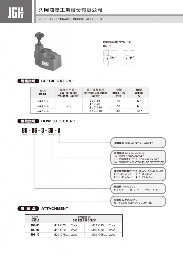JGH先導式溢流閥常規(guī)型號參考:BG-03-0 , BG-03-1 , BG-03-2 , BG-03-3 , BG-06-0 , BG-06-1 , BG-06-2 , BG-06-3 , BG-10-0 , BG-10-1 , BG-10-2 , BG-10-3