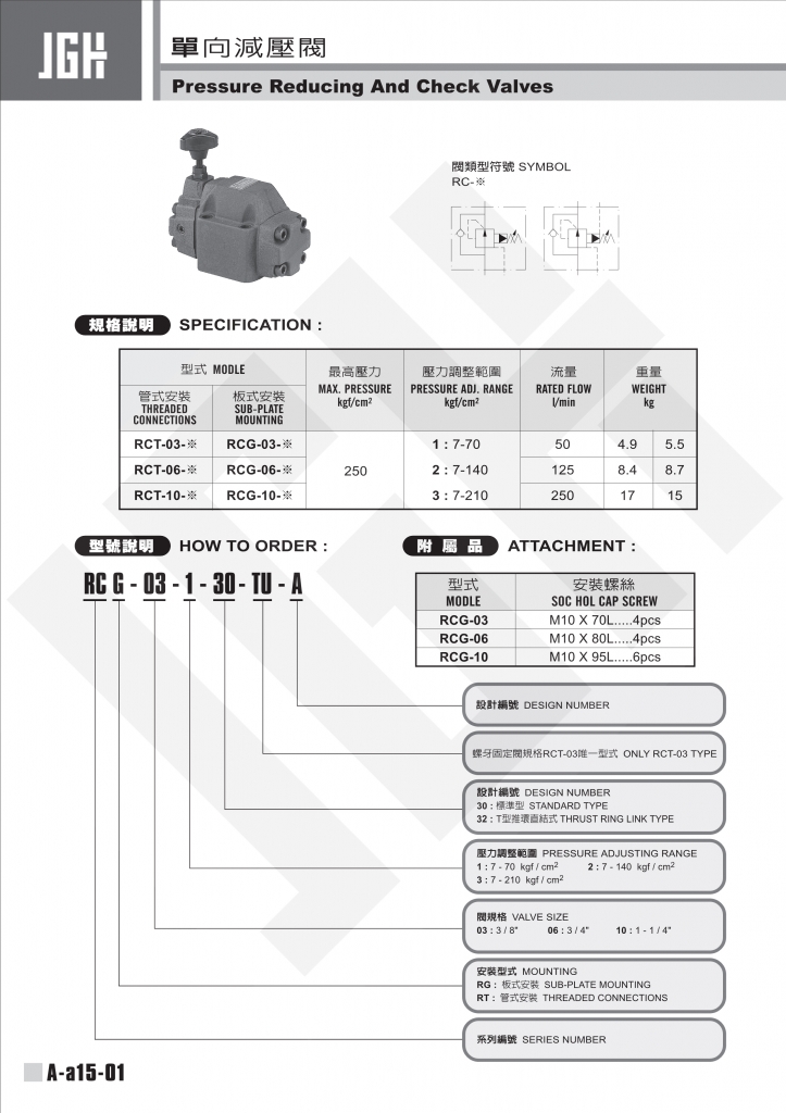 規(guī)格說明 型式 最高壓力 kgf/cm2 壓力調(diào)整範(fàn)圍 kgf/cm2 流量 l/min 重量 kg 管式安裝 板式安裝 RCT-03-※ RCG-03-※ 250 1 :?7-70 2 :?7-140 3 :?7-210 50 4.9 5.5 RCT-06-※ RCG-06-※ 125 8.4 8.7 RCT-10-※ RCG-10-※ 250 17 15 JGH單向減壓閥常規(guī)型號參考:RCG-
