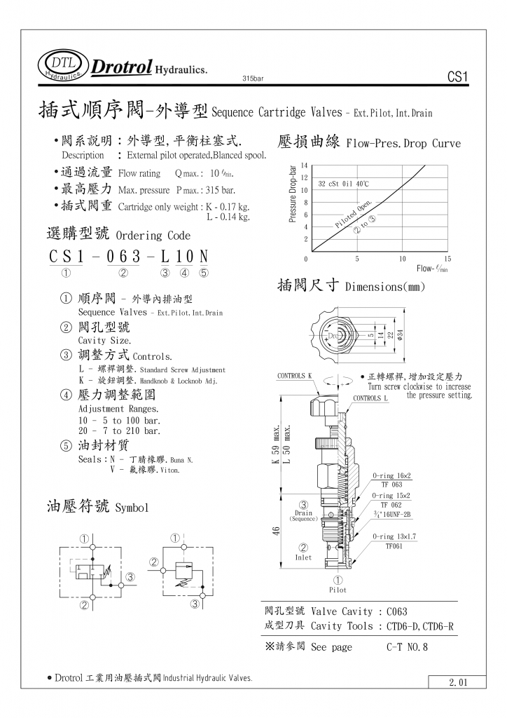DTL插式順序閥部分常規(guī)型號參考:CS1-063-L10V , CS1-063-K10V , CS1-063-L20V , CS1-063-K20V , CS1-063-L10N , CS1-063-K10N , CS1-063-L20N , CS1-063-K20N ,