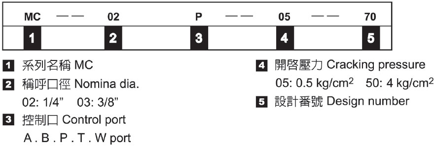 MC 也可稱為止回閥,單向閥或背壓閥.它的油壓控制,有開啟和關閉的功能,可防止流體逆流 特性 體積小、輕巧、耐用。 型式號碼 最大壓力 (KG/CM2) 最大流量 (L/MIN) MC-02* 210 35 MC-03* 70