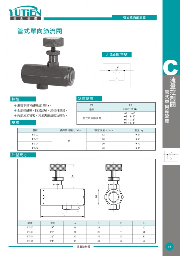 YUTIEN管式單向節(jié)流閥部分常規(guī)型號(hào)參考:PT-02 , PT-03 , PT-04 , PT-06