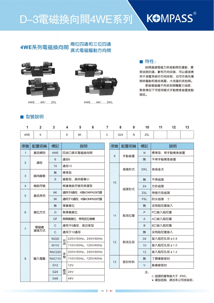 KOMPASS電磁換向閥部分常規(guī)型號參考:4WE6 , 4WE10 , 4WE6S , 4WE10S