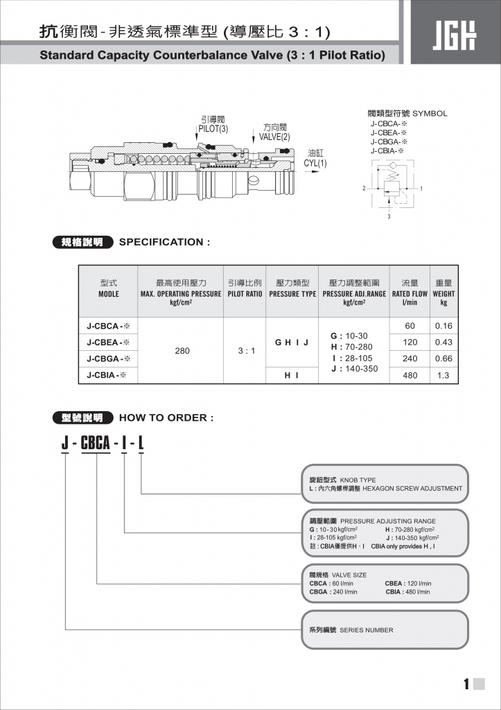 MODLE MAX.OPERATING PRESSURE kgf/cm2 PILOT RATED PRESSURE TYPE PRESSURE ADJ. RANGE kgf/㎝2 MAX. FLOW l/min WEIGHT kg J-CBC/GA-※ 350 3:1/4.5 G ?H??I ? J I :?28-105 H :?70-280 G:10-30 J:140-350 60 0.16 J