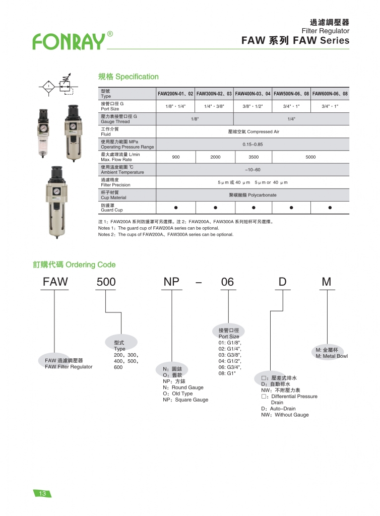 過(guò)濾調(diào)壓閥 – FAW 型號(hào) 接管口徑 (G/PT) 最大流量 (L/min) 過(guò)濾精度 (μm) 使用壓力範(fàn)圍 (Mpa) FAW200N-01 、 02 1/8″ 、 1/4″ 900 5 ( 泡棉 ) 20 ( 銅 ) 0.15 ~ 0.85 FAW300N-02 、 03 1/4″ 、 3/8″ 2000 FAW400N-03 、 04 3/8″ 、 1/2″ 3500 FAW
