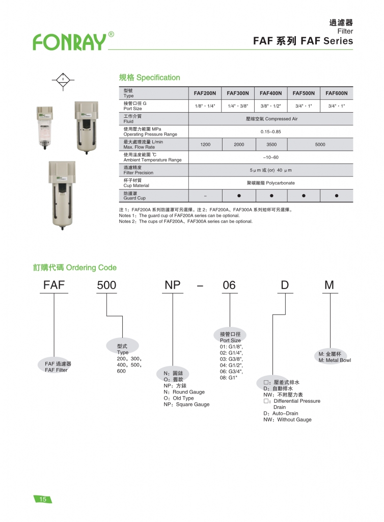 過濾器 – FAF 型號(hào) 接管口徑 (G/PT) 最大流量 (L/min) 過濾精度 (μm) 使用壓力範(fàn)圍 (Mpa) FAF200N-01 、 02 1/8 ″ 、 1/4 ″ 1200 5 ( 泡棉 ) 20 ( 銅 ) 0.15 ~ 0.85 FAF300N-02 、 03 1/4 ″、 3/8 ″ 2000 FAF400N-03 、 04 3/8 ″、 1/2 ″ 3500