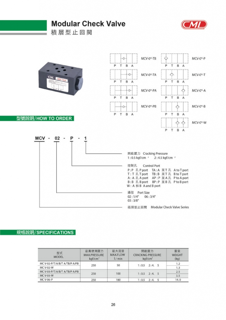 CML全懋疊加閥 積層式止回閥 MCV-02,MCV-03系列