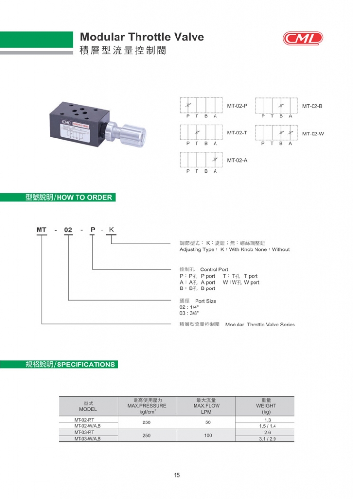 型式 MODEL 最高使用壓力 MAX.PRESSURE kgf/c㎡ 最大流量 MAX.FLOW LPM 重量 WEIGHT (kg) MT-02-P,T 250 50 1.3 MT-02-W/A/B 1.5 / 1.4 MT-03-P,T 250 100 2.6 MT-03-W/A/B 3.1 /2.9