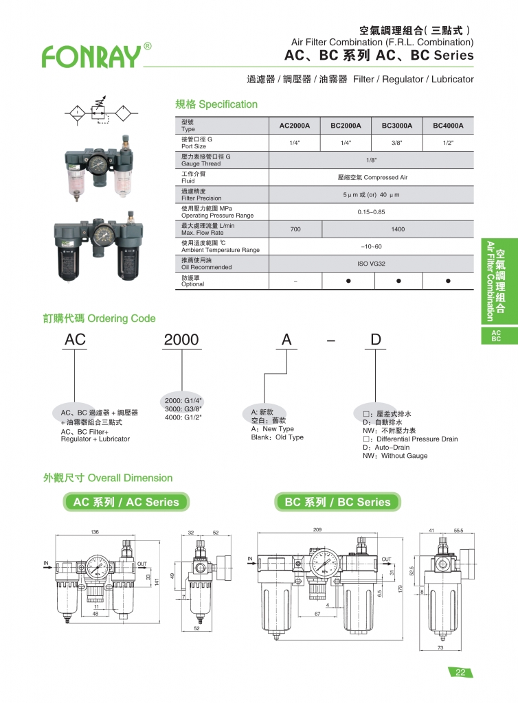 過濾器 + 調壓閥 + 油霧器?–?AC、BC